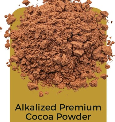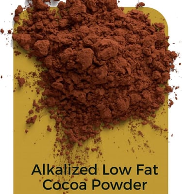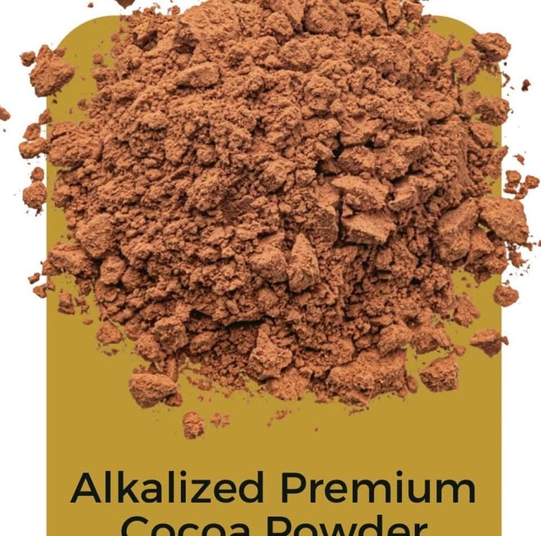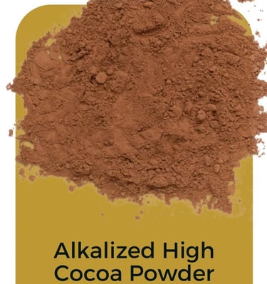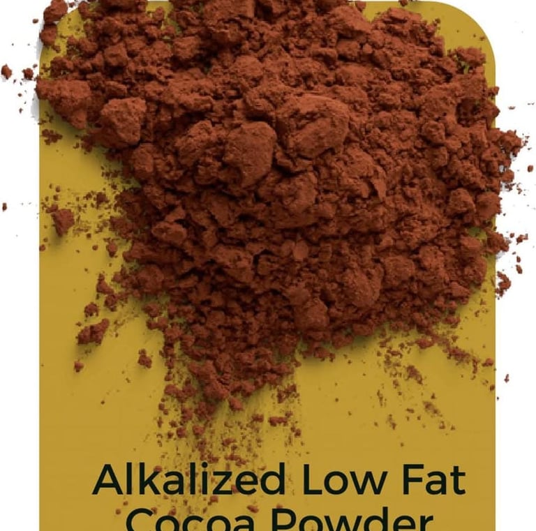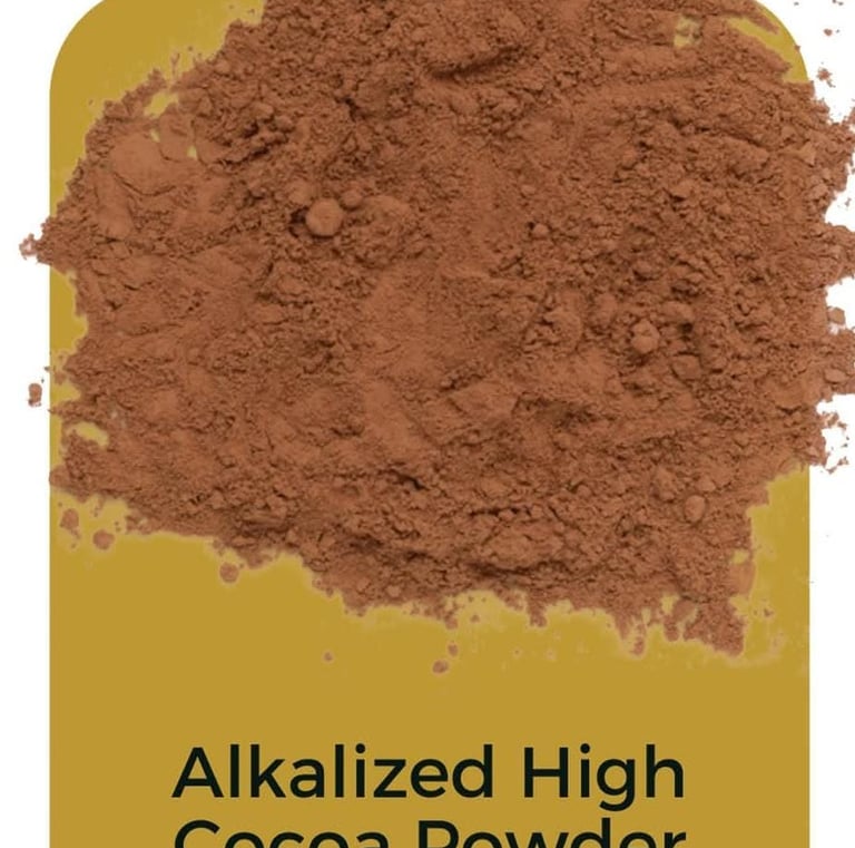 Alkalized cocoa powder with optimal fat, dark color, stable pH, safe packaging, various applications.