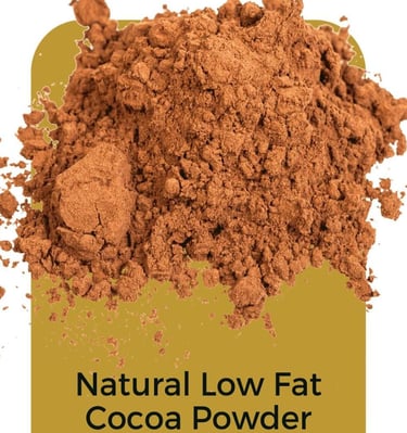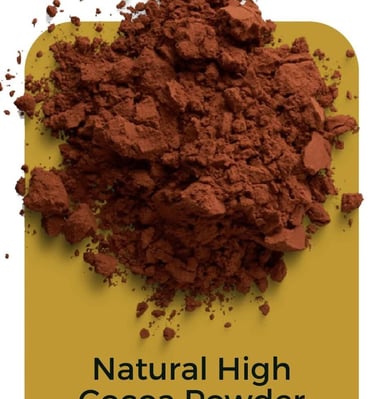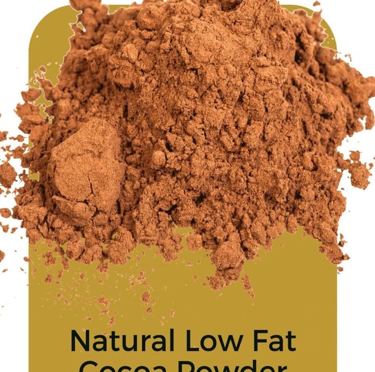 Natural cocoa powder with low fat, brown color, balanced pH, flexible packaging, wide application.